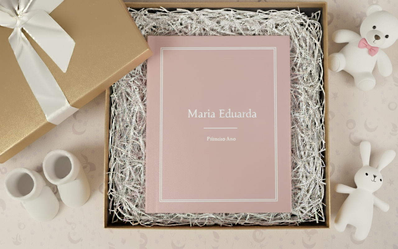 Vocês recebem em casa um livro lindamente impresso com todos os relatos, imagens e memórias selecionadas deste primeiro ano. Uma recordação única que conta a história completa do seu bebê, preservando todos os momentos mágicos que fotos sozinhas não conseguem capturar.
